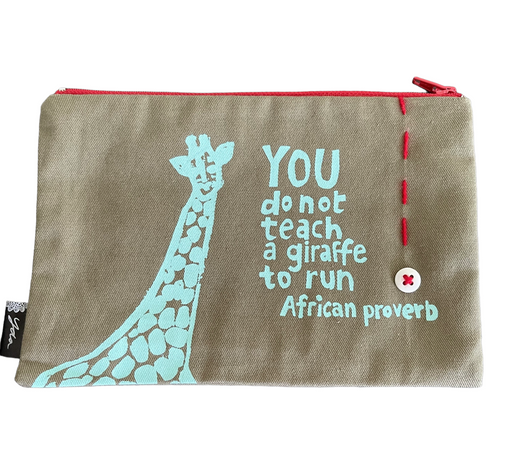 "You do not teach a giraffe to run." This beautiful handcrafted flat pouch showcases a traditional African Proverb. Screen printed and fully lined...
