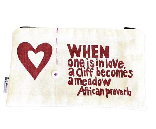 "When one is in love, a cliff becomes a meadow." This beautiful handcrafted flat pouch showcases a traditional African Proverb. Screen printed and...