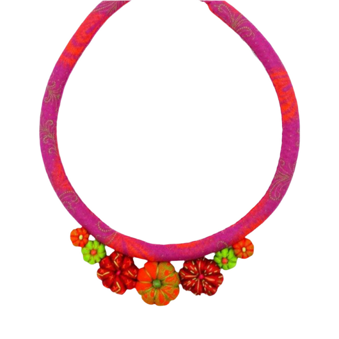 This African Moon necklace is made from genuine South African shweshwe fabric and raw silk. The necklace is easily fastened by means of a textile button.